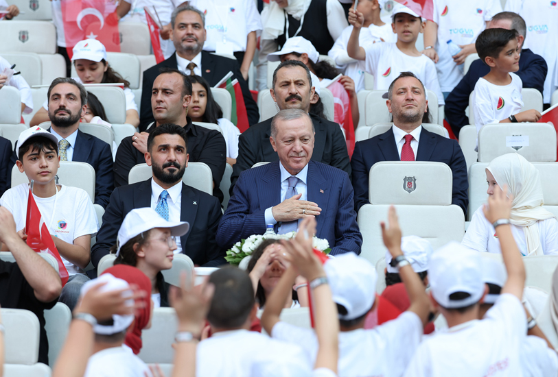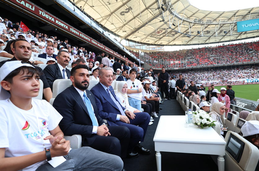 Öğrencilere rehberlik eden, birikimiyle genç kardeşlerine yeni ufuklar çizen tüm hocaları tebrik eden Cumhurbaşkanı Erdoğan, “Buradaki siz çocuklarımızla birlikte Türkiye’nin geleceğini şekillendirecek her bir evladımızın gözlerinden öpüyorum. Kalbi Türkiye için çarpan, yüreğinde Filistin’in, Gazze’nin derdi, hüznü olan sizin gibi gençleri yetiştiren anne ve babalara saygılarımı gönderiyorum” diye konuştu.