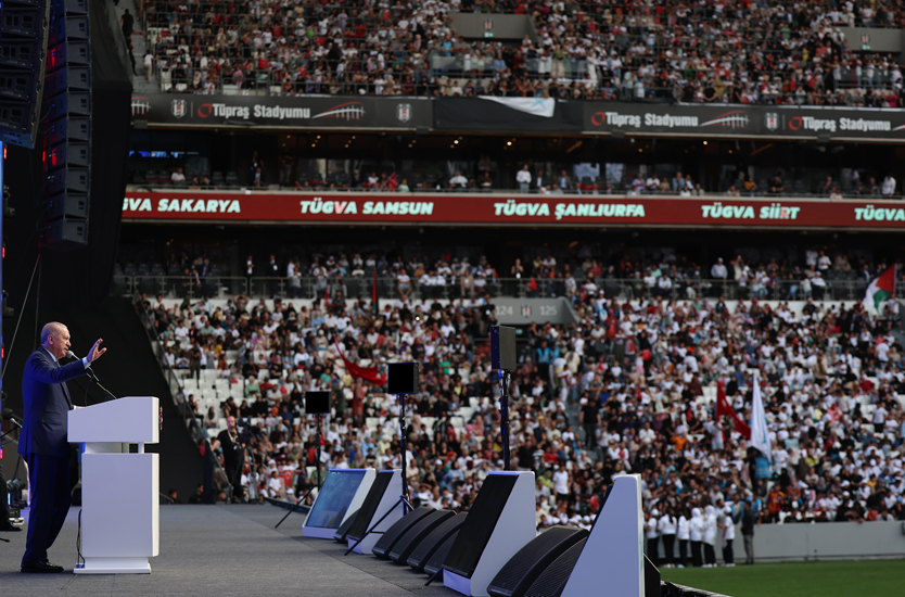Cumhurbaşkanı Erdoğan, şunları söyledi: “Kusura bakmayın, kimseyi kandıramazsınız. Çünkü siz hiçbir zaman mazlumların yanında olmadınız. Çünkü siz Orta Doğu’ya hiçbir zaman kardeşlik penceresinden bakmadınız. Ümmet olmanın ne demek olduğunu anlamadınız. Bu duyguyu hiçbir zaman yüreğinizde hissetmediniz. Şimdi çıkmış kapkara sicilinize bakmadan bizi eleştiriyorsunuz. Kabine üyelerimizi eleştiriyorsunuz. Bakanlarımıza seviyesizce dil uzatıyorsunuz. Ne yaparsanız yapın, bize kara çalamayacaksınız. Filistin halkının kalbindeki Türkiye sevdasını, Tayyip Erdoğan sevdasını söküp atamayacaksınız. Türk milletinin bir asır sonra kardeşleriyle yeniden kucaklaşmasına engel olamayacaksınız. Siz inkâr etseniz de tarih bizim dik duruşumuzu yazıyor. Türkiye’nin verdiği zorlu mücadele mümin gönüllere iftiharla kazınıyor. Şuna da tüm hücrelerimize inanıyoruz; hürriyetin o kızıl kapısı mutlaka açılacak. Gazzeli kardeşlerimiz, öz yurtlarında, şehit kanlarıyla sulanmış o mübarek topraklarda inşallah ebediyen özgürce yaşayacak. O kutlu gün geldiğinde Allah nasip ederse biz de orada olacağız.”