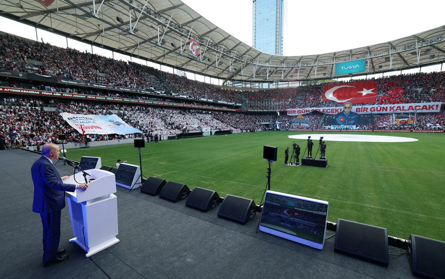 Cumhurbaşkanı Erdoğan, 81 ildeki eğitim kurumlarını kütüphanelerle, yurtlarla, gençlik ve spor tesisleriyle, bilim merkezleriyle gençler için donattıklarını, gidecek daha çok yolları, Türkiye’ye kazandıracakları pek çok reform, yatırım ve hizmet olduğunu belirterek şunları söyledi: “Ne diyor şair? ‘Tasalanma yiğidim, zaman bizden yanadır/Külümüzden yükselen duman bizden yanadır/Son durak, son ilahi ferman bizden yanadır/Dünya düşman olsa da iman bizden yanadır/Kapıları açacak coşkun bin niyaz kaldı/Ufka bir bak yiğidim, inkılaba az kaldı.’ Türkiye Yüzyılı vizyonumuzun kuvveden fiile çıkmasına çok az kaldı. Milletimizin hasretini çektiği büyük ve güçlü Türkiye’ye kavuşmamıza çok az kaldı. Zulümle, krizle, çatışmayla boğuşan coğrafyamızda, barış rüzgârlarının esmesine inanın çok az kaldı. Sizlere terörün olmadığı, her metrekaresinde huzurun, güvenliğin, refahın, kardeşliğin egemen olduğu bir Türkiye’yi teslim edeceğiz. Son nefesimize kadar sizlerin hizmetinde olmaya devam edeceğiz.”
